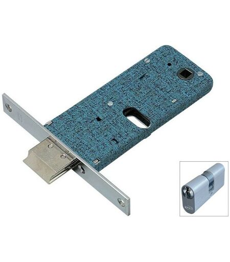Serratura per fasce. Scrocco, 2 mandate, quadro maniglia in acciaio brunito, cilindro, 3 chiavi, scatola mm. 133x64. ...