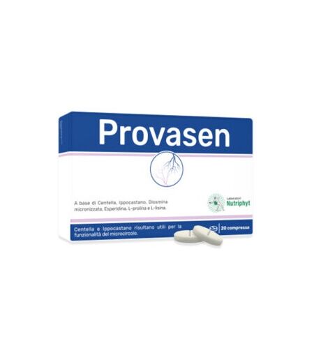 Provasen - compresse - Descrizione Integratore alimentare a base di centella, ippocastano, diosmina micronizzata, esperidina, L - prolina e L - lisina. Centella e ippocastano risultano utili per la funzionalità del microcircolo. Ingredienti Agente di carica: cellulosa microcristallina; diosmina mic… ...