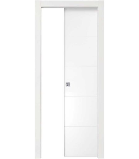 La Porta Scorrevole Interno Muro Iris New Contract Di Effebiquattro Rappresenta Una Soluzione Pratica E Funzionale Per Ottimizzare Gli Spazi Interni. Il Sistema A Scomparsa Consente Di Eliminare L'ingombro Tipico Delle Porte A Battente, Creando Ambienti Più Fluidi E Vivibili. L'anta, Di Dimensioni 80x210 Cm, Presenta Una Struttura Tamburata Con Riempimento In Truciolare Forato Flexboard Fonoassorbente A 28,5 Db E Perimetro In Legno Massello Di Abete, Che Assicura Un Buon Isolamento Acustico Tra Gli Ambienti. La Finitura Pantografata Con Quattro Fresate Orizzontali Dona Un Tocco Di Sobrietà E Modernità, Adattandosi A Diversi Stili Di Arredamento. Il Colore Bianco Seta Ral 9016 Offre Luminosità E Si Integra Facilmente Con Le Pareti. Il Telaio E I Coprifili, Inclusi, Sono Realizzati In Legno E Rivestiti In Laminato Cpl Bianco. I Coprifili Telescopici, Adatti Per Pareti Con Spessore Da 10 A 12 Cm, Permettono Di Adattare La Porta A Diverse Configurazioni Murarie, Garantendo Una Finitura Precisa E Curata. La Porta È Reversibile, Offrendo Flessibilità In Fase Di Installazione. La Serratura Verniciata Color Silver Con Tiraporta Incorporato È Già Montata, Semplificando Ulteriormente L'installazione. Le Guarnizioni In Schiuma Contribuiscono A Migliorare L'isolamento Acustico E Termico. Realizzata In Italia, Questa Porta Scorrevole Coniuga Funzionalità, Estetica E Qualità Dei Materiali. ...