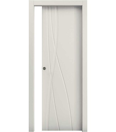 La Porta Da Interno Scorrevole A Scomparsa Paola New Contract Di Effebiquattro, Realizzata In Italia, Unisce Funzionalità E Praticità. La Finitura Laccata Bianca E Il Design Pantografato La Rendono Adatta A Diversi Stili Di Arredamento. L'anta, Di Dimensioni 70x210 Cm, Ha Uno Spessore Di 4,4-4,5 Cm Ed È Composta Da Un Perimetro In Abete Massello E Da Un'anima Tamburata Con Riempimento In Truciolare Forato Flexboard Fonoassorbente A 28.5 Db, Che Contribuisce A Ridurre I Rumori Tra Gli Ambienti. Il Telaio E I Coprifili Telescopici In Legno, Adatti A Pareti Con Spessore Da 10,5 A 12 Cm, Sono Inclusi. Le Guarnizioni In Schiuma Migliorano Ulteriormente L'isolamento Acustico E La Tenuta. La Porta È Reversibile, Offrendo Flessibilità In Fase Di Installazione. Il Kit Comprende La Predisposizione Per Il Montaggio Del Telaio E La Serratura Verniciata Color Argento Con Tiraporta Incorporato. La Maniglia Non È Inclusa. ...
