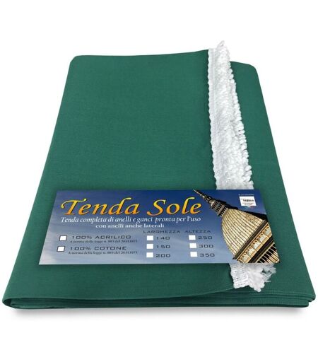 Tenda sole 'unito verde' confezionata già pronta per l'uso realizzata in tessuto indistruttibile di acrilico. Rifinita nella parte superiore con puntina e occhielli in acciaio mentre nei lati orlo semplice e nella parte inferiore frangia abbinata. È dotata di ganci in plastica che agganciati agli occhielli in acciaio della tenda gli permettono di essere montata su qualsiasi tipo di bastone. Gli anelli in plastica hanno un diametro di 16 mm, mentre quelli in acciaio dove si agganceranno quelli in plastica hanno un diametro di 9 mm. La tenda non è stampata, come nel caso delle tende da sole economiche, ma il colore è realizzato a telaio in tinto filo. È in tessuto acrilico che resiste ad alte temperature ed ha una durata di parecchi anni. -tessuto..................................................acrilico -funzione tessuto...................................coprente -composizione tessuto.......................100% acrilico -finitura superiore.........................occhielli in acciaio ...