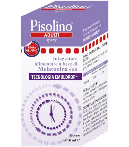 Pisolino ADULTI spray Descrizione Integratore alimentare a base di melatonina, con tecnologia brevettata Emuldrop. La melatonina contribuisce alla riduzione del tempo richiesto per prendere sonno. L’effetto benefico si ottiene con l’assunzione, poco prima di coricarsi, di 1 mg di melatonina. Ingredienti Stabilizzante: glicerolo; acqua demineralizzata; emulsionante: polisorbato 80; correttore di acidità: sodio bicarbonato; melatonina; emulsionante: acido linoleico coniugato. Senza glutine. Naturalmente privo di lattosio. Caratteristiche nutrizionali Informazioni nutrizionaliper 100 mlper 1 erogazione Melatonina813 mg1 mg Modalità d'uso 1 erogazione spray al giorno, la sera poco prima di coricarsi. Applicare 1 erogazione direttamente nel cavo orale. Agitare il flacone prima di ciascun utilizzo. Avvertenze Non superare la dose giornaliera consigliata. Tenere fuori dalla portata dei bambini al di sotto dei 3 anni di età. Gli integratori alimentari non vanno intesi come sostituti di una dieta variata ed equilibrata e di uno stile di vita sano. Per l’uso del prodotto sentire il parere del medico. Conservazione Conservare a temperatura ambiente in luogo fresco ed asciutto, lontano da fonti di calore e al riparo dall’umidità. Il termine minimo di conservazione si riferisce al prodotto correttamente conservato, in confezione integra. Non disperdere nell’ambiente dopo l’uso. Validità a confezionamento integro: 36 mesi. Formato Flacone da 10 ml con erogatore spray orale. ...