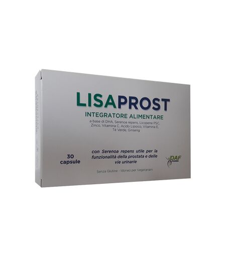 LISAPROST - Descrizione Integratore alimentare a base di DHA serenoa repens licopene PSC zinco vitamina C acido lipoico vitamina E tè verde ginseng. Idoneo per vegetariani. - Senza glutine. Proprietà Serenoa repens: utile per la funzionalità della prostata e delle vie urinarie. Conservazion… ...