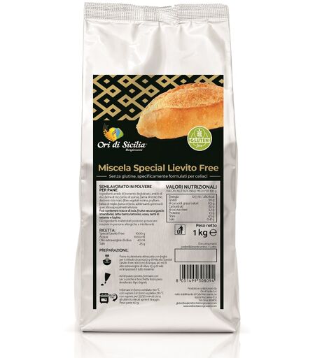 Ori di Sicilia Miscela Special Lievito Free Descrizione Semilavorato in polvere per pane, specificamente formulato per celiaci. Prodotto adatto per la realizzazione del pane dal sapore stuzzicante, senza alcuna aggiunta di lievito. Ingredienti Amido di frumento deglutinato, amido di riso, farina di riso, farina di quinoa, farina di lenticchie, destrosio (da mais); fibre vegetali: inulina, psyllium; farina di miglio, farina di fonio; addensanti: gomma di guar, idrossipropilmetilcellulosa. Senza glutine Caratteristiche nutrizionali Valori medi Per 100 g Energia 1.253 kJ / 280 kcal Grassi di cui acidi grassi saturi 3,6 g 0,5 g Carboidrati di cui zuccheri 55 g 3,2 g Fibre 4,5 g Proteine 1,5 g Sale 0,41 g Modalità d'uso RICETTA Miscela Special Lievito Free 1.000 g Acqua 1.000 ml Olio extravergine di oliva 40 ml Sale 25 g Preparazione - Porre in planetaria con foglia per 5 minuti circa: 1.000 g di prodotto, 1.000 ml di acqua, 40 ml di olio extravergine di oliva, 25 g di sale ed impastare il tutto insieme. . - Ad impasto pronto, formare con sac a poché e bocchetta liscia peso desiderato (tipo bigné). - Mettere in forno ventilato 190°C con vapore o in forno a platea 210°C con vapore per 25/30 minuti circa; gli ultimi 5 minuti aprire il tiraggio; peso pane: 60 g. Avvertenze Può contenere tracce di soia, frutta secca a guscio (mandorle), latte (senza lattosio), uova, semi di sesamo, lupino. Conservazione Conservare a temperatura ambiente. Validità a confezionamento integro: 12 mesi. Validità post apertura: 12 mesi. Formato Busta da 1 kg. Cod. 809 ...
