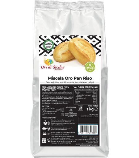 Ori di Sicilia Miscela Oro Pan Riso - Descrizione Preparato per pane e pizza senza glutine, senza latte e senza mais. Fonte di fibre. Ingredienti Farina di riso, amido di riso; fibra vegetale: psyllium; zucchero; addensante: idrossipropilmetilcellulosa; aromi. Può contenere tracce di soia, frutta s… ...