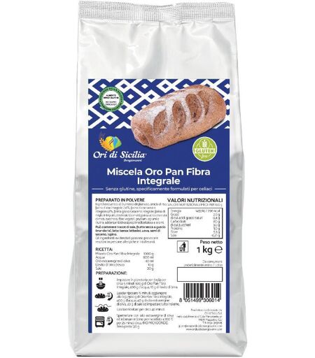 Ori di Sicilia - Miscela Oro Pan Fibra Integrale - Descrizione Preparato in polvere specificamente formulato per celiaci. Prodotto per pane integrale e fragrante, dalla tipica forma a pagnotta. - Ingredienti Amido di frumento deglutinato, amido di riso, farina di riso integrale 2,6%, farina di mais… ...