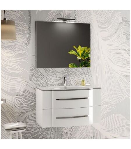 Composizione da bagno sospesa dalla forma sinuosa e particolarmente elegante adatta ad un arredobagno con design innovativo. la composizione comprende base sospesa a due cassettoni a chiusura rallentata (soft close).frontaledel mobile leggermente curvato. realizzato il tutto in mdf nobilitato rivestito.lavabo in mineral marmo finitura bianco lucido tuttopiano.faretto a led cromato. specchiera filo lucido. maniglie in abs cromato.finitura mobilebianco lucido laccato. dimensioni mobile: l=90cm p=40/51cm h=50cm. specchiera: l=90cm h=70cm.rubinetteria non inclusa.prodotto scatolato ...