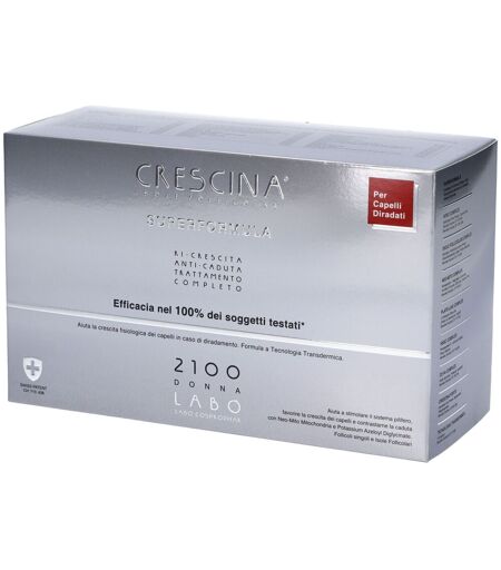 Labo Crescina Isole Follicolari e Anti-Caduta Superformula Trattamento Completo 2100 Donna 20+20 fialeIl Trattamento Completo Crescina Transdermic Isole Follicolari e Anti-Caduta Superformula è un trattamento ad uso topico di impiego cosmetico composto da due tipi di fiale. Crescina Transdermic Isole Follicolari Superformula (fiale ambra) contiene il complesso Ri-Crescita (Cisteina, Lisina, Glicoproteina) associato al nuovo componente Potassium Azeloyl Diglycinate specifico per il diradamento progressivo, il complesso Isole Follicolari, il complesso Hfsc, 5 Enhancer, gli attivi Hair Booster 177 e il complesso Neo-MITO – Mitochondria (Nonapeptide-1, Magnesium Gluconate, Carnitine Fumarate, SOD-Like e Calcium Pca) per aiutare a stimolare il sistema pilifero favorendo l'attività del preparato, promuovendo la crescita fisiologica dei capelli e sostenendo la protezione dellìmtDNA. Nella formula sono inoltre presenti 12 molecole Plate-Like di sintesi simili alle molecole peptidiche endogene presenti naturalmente nel sistema pilifero, deputate a favorire fisiologicamente e in modo sinergico la crescita del capello. Completa la formula il complesso Scalp Microbiome Complex, per riequilibrare il microbioma naturalmente presente sul cuoio capelluto. Crescina Anti-Caduta Superformula (fiale incolore) contiene i principi attivi di base (Idrossiprolina, Acido Aspartico, AttivatoreEnzimatico e Taurina) e gli attivi Hydrolyzed Yeast Protein e Acetyl Tetrapeptide-3, utili a rinforzare i capelli alla radice (test in vitro sugli attivi), 3 molecole Plate-Like (sh-Polypeptide-2, sh-Polypeptide-8, sh-Polypeptide-10), i complessi Hssc e Neo-MITO per aiutare a stimolare il sistema pilifero favorendo l'attività del preparato e contrastare la caduta. La presenza dei 5 Enhancer coadiuva la penetrazione degli attivi nel sistema pilifero e nel cuoio capelluto.Modo d´uso:1. Prendi dall’alloggio l’apposito rompifiala in plastica rigida incluso nella confezione.2. Inserisci il rompifiala sulla fiala, semplicemente appoggiandolo. Stringi tra le dita il rompifiala e rompi la parte alta della fiala facendo una leggera ma decisa pressione.3. Prendi dall’alloggio il dosatore con beccuccio.4. Inserisci l’apposito dosatore con beccuccio sulla fiala aperta.5. Togli il cappuccio del dosatore.6. Applica il preparato sul cuoio capelluto pulito e asciutto, riga per riga, insistendo sulle zone più diradate, facendo attenzione a non farlo colare sul viso. Fai penetrare con leggero massaggio.Ingredienti:Crescina Transdermic Isole Follicolari Superfomula - Alcohol Denat., Aqua, Glycerin, Caprylyl Glycol, Pentylene Glycol, Proline, Phenoxyethanol, Butylene Glycol, Potassium Azeloyl Diglycinate, Propanediol, Lysine HCl, Carnitine Fumarate, Benzyl Nicotinate, Acetyl Cysteine, Calcium Pca, Decylene Glycol, Magnesium Gluconate, Propylene Glycol, Resveratrol, Benzophenone-4, Glycogen, Laminaria Digitata Extract, Hydrolyzed Lupine Protein, Menthol, Silanediol Salicylate, Glutamine, Triethanolamine,... ...