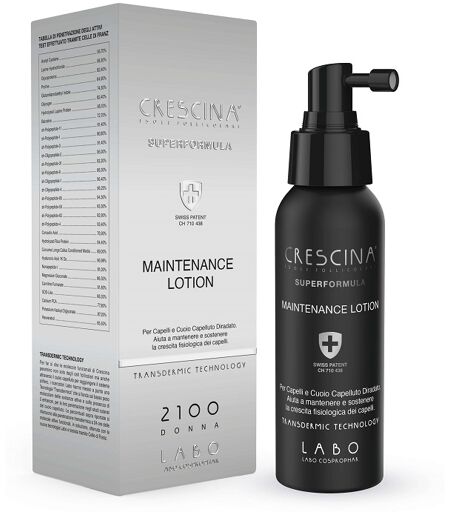 CRESCINA MAINTENANCE LOTION 2100 - Descrizione CRESCINA MAINTENANCE LOTION è una lozione spray che contiene tutte le componentiattive del trattamento in fiale, in dosaggio ottimizzato per consentire il protocollopiù adeguato idoneo a fornire continuativamente ai bulbi e ai follicoli piliferisia sin… ...