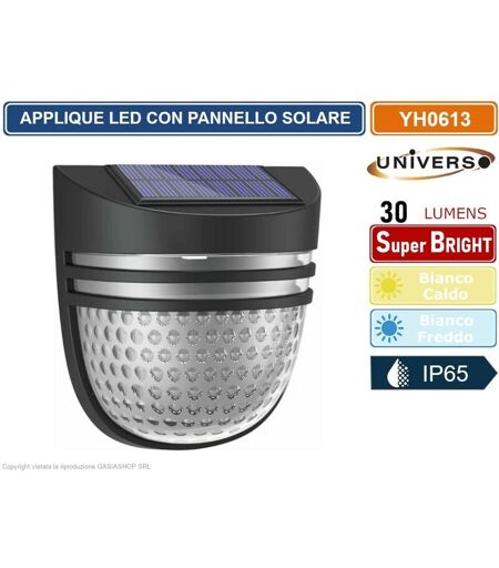 Faretto LED Universo YH0613 con potenza di 3W. Corpo in materiale plastico di colore nero con un design moderno e pulito. Fascio luminoso di 120° e flusso luminoso di 30 lm. Il corpo illuminante frontale è composto da 4 Power Led SMD. Grazie al grado di protezione IP65, è adatto all'uso esterno anche sotto la pioggia prolungata. Questo faretto ha la particolarità di essere autonomo , alimentato a batteria (inclusa), e quindi installabile anche in luoghi dove non arriva la corrente elettrica. É equipaggiato con una batteria ricaricabile (3,2V al Litio da 500 mAH) ed un pannello solare che garantiscono un'autonomia di 8/10 ore. La ricarica avviene in circa 5-6 ore con luce solare diretta. Modalità di funzionamento disponibili: Modalità 1 luminosità durata 8 ore (luce forte) Modalità 2 luminosità durata 10 ore (luce tenue) Una soluzione ecologica ed innovativa per illuminare in modo intelligente. Nella confezione riceverete anche le viti per il fissaggio a muro. Lampada disponibile con ...