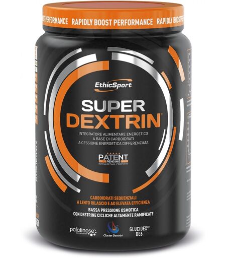 Super Dextrin Descrizione Integratore alimentare energetico a base di carboidrati di nuova generazione a cessione energetica differenziata. La formula sfrutta la sinergia tra Cluster Dextrin (HBCD = destrine cicliche altamente ramificate), Palatinose (Isomaltulosio) e maltodestrine a diversa destrosio equivalenza (DE6 e DE18). La presenza sinergica delle HBCD unite alle DE6 consente una bassa pressione osmotica della miscela, che permette un rapido ed efficace svuotamento gastrico. La diversa struttura molecolare dei carboidrati contenuti favorisce una cessione dell'energia differenziata, consentendo una migliore distribuzione delle scorte energetiche. La formulazione di SUPER DEXTRIN è brevettata, grazie alle caratteristiche particolarmente innovative. Il prodotto si rivolge a tutti i soggetti che svolgono attività fisica intensa e/o prolungata, che comporti affaticamento muscolare e depauperamento delle riserve di glicogeno nei muscoli. Ingredienti Destrina ciclica altamente ramificata (Cluster Dextrin), maltodestrina da mais DE18, isomaltulosio* (Palatinose), maltodestrina da mais DE6 (Glucidex), aroma; acidificante: acido citrico. *L'isomaltulosio è una fonte di glucosio e di fruttosio. Senza caffeina. Caratteristiche nutrizionali Analisi mediaPer 100 g Per dose (50 g) Valore energetico 381 kcal 1.619 kJ 190 kcal 810 kJ Grassi totali di cui saturi 0 g 0 g 0 g 0 g Carboidrati di cui zuccheri 95 g 22 g 47 g 11 g Proteine 0 g0 g Sale (Nax2,5) 0,16 g 0,08 g NRV: Valori Nutritivi di Riferimento (adulti) ai sensi del Reg. UE 1169/2011. Modalità d'uso Sciogliere 50 g di prodotto (3 misurini rasi) in circa 500 ml di acqua, da assumere durante l'attività fisica. In caso di attività particolarmente intense, con difficoltà di rifornimento durante, il prodotto può essere utilizzato anche prima dell'attività fisica. È preferibile non superare la dose massima di 150 g al giorno di polvere, pari a 3 borracce da 500 ml di soluzione. Avvertenze Non superare la dose giornaliera consigliata. Tenere fuori dalla portata dei bambini al di sotto dei 3 anni d'età. Gli integratori alimentari non vanno intesi come sostituti di una dieta varia ed equilibrata e di un sano stile di vita. Conservazione Conservare a temperatura ambiente. Validità a confezionamento integro: 36 mesi. Formato 700 g Cod. DEX ...