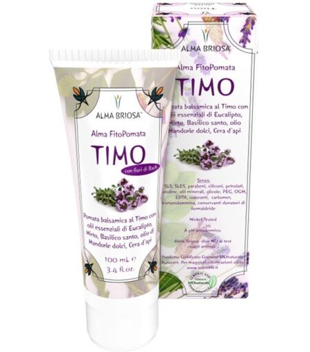 Fitopomata Timo Alma Briosa: Fitopomata balsamica e rinfrescante. Rinfresca e calma la pelle, garantendone la corretta idratazione. Per screpolature.Con timo, eucalipto, mirto, basilico santo e cera d'api. Applica su petto, pianta dei piedi, naso e labbra. La Fitopomata Timo di Alma Briosa è una fitopomata balsamica, rinfrescante e calmante per screpolature ed arrossamenti. A base di timo, eucalipto, mirto, basilico santo e cera d'api dall'azione purificante e disinfettante che idrata e lenisce la pelle. La miscela floriterapica allevia il disagio legato all'irritazione delle mucose. Consigli d'uso:Applica un abbondante strato sulla zona da trattare, massaggiando lentamente. INCIAqua**; Glyceryl Stearate SE**; Glycerin**; Prunus Amygdalus Dulcis (Sweet Almond) Oil*/**; Thymus Vulgaris Extract**; Bisabolol**; Caprylic/Capric Triglyceride**; Sodium Cetearyl Sulfate**; Cetearyl Alcohol**; Beeswax**; Ocimum Sanctum Leaf Extract**; Vitis Vinifera (Grape) Seed Oil**; Glyceryl Stearate**; Eucaliptus Globulus Leaf Oil**; Myrtus Communis Oil**; Thymus Vulgaris (Thime) Oil**; Centaurium Erythraea (Centaury) Flower Extract**; Prunus Cerasus (Cherry Plum) Flower Extract**; Aesculus Hippocastanum (Chestnut Bud) Bud Extract**; Cichorium Intybus (Chicory) Flower Extract**; Verbena Officinalis (Vervain) Flower Extract**; Benzyl Alcohol; Potassium Sorbate; Xanthan Gum**; Limonene**. * ingrediente da agricoltura biologica ** ingrediente di origine vegetale / naturale Controlliamo con cura le descrizioni dei nostri prodotti ma alcuni dati riportati sulla confezione del prodotto (INCI, consigli di utilizzo, certificazioni) possono variare in base agli aggiornamenti dei produttori. Non sempre questi aggiornamenti ci vengono comunicati e può capitare che le informazioni sulla confezione differiscano da quelle riportate qui sul sito. Ti chiediamo perciò di fare sempre riferimento alle informazioni che trovi sul prodotto. Le immagini riportate hanno uno scopo puramente indicativo e possono essere soggette a variazioni da parte dei produttori. ...
