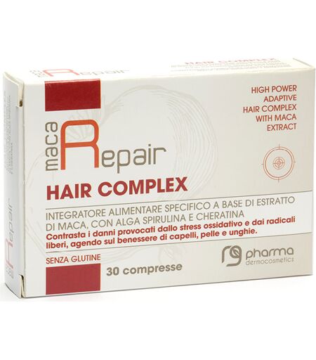 MACA REPAIR HAIR COMPLEX - Descrizione Integratore alimentare per il benessere di capelli pelle e unghie. A base di estratto di Maca con Alga Spirulina e Cheratina. - Modalità d'uso Si consiglia di assumere 1 compressa al giorno al mattino o durante il pasto principale. - Componenti Maca andina (L… ...
