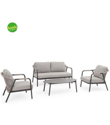Set salotto Miravet di colore antracite/khaki prodotto dal brand Bizzotto. Lasciati conquistare dall'eleganza senza tempo del salotto Miravet, firmato Bizzotto. La combinazione di antracite e khaki crea un'atmosfera raffinata e contemporanea, perfetta per arredare il tuo spazio esterno. La struttura in alluminio, resistente e leggera, è rivestita con un intrigante intreccio in corda di poliestere, che dona un tocco di calore e accoglienza. Il piano del tavolino, in pietra sinterizzata, riproduce alla perfezione l'aspetto della pietra naturale, conferendo al set un'eleganza senza pari. I cuscini, sfoderabili e realizzati in tessuto idrorepellente 100% poliestere, offrono il massimo comfort e sono facili da pulire. La viteria in acciaio inox garantisce la massima resistenza agli agenti atmosferici. Misure (LxPxA): Divano 3 posti: 148 x 81 x 73,5 cm (seduta 40, altezza braccioli 63) Divano 2 posti: 68 x 81 x 73,5 cm (seduta40, altezza braccioli 63) Tavolino: 120 x 60 x 39 cm Il tavolino ...
