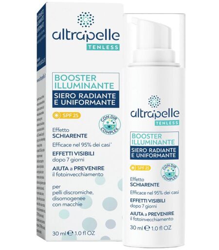 Altrapelle TENLESS - BOOSTER ILLUMINANTE SIERO RADIANTE E UNIFORMANTE - Descrizione Booster illuminante per pelli discromiche, disomogenee o con macchie. Ideale per viso e décolleté. Effetto schiarente, efficace nel 95% dei casi. Effetti visibili dopo 7 giorni. Aiuta a prevenire il foto - invecchia… ...