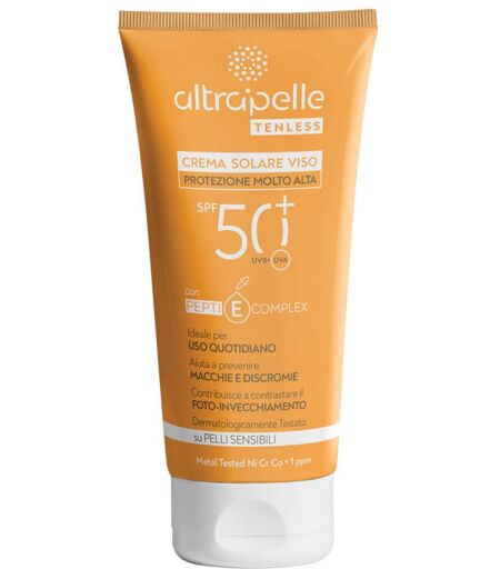 altrapelle - TENLESS CREMA SOLARE VISO - Descrizione Crema solare ideale per viso, mani, collo e decolletè. Fattore di protezione solare SPF 50+ UVB+UVA. Con pepti e complex. Ideale per uso quotidiano. Aiuta a prevenire macchie e discromie. Contribuisce a contrastare il foto - invecchiamento. - Sen… ...