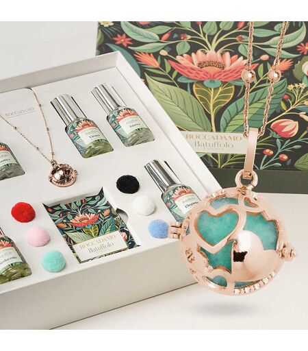 Collana Da Donna Di Boccadamo Della Collezione Batuffolo. Collana Placcata Oro Rosa Con Ciondolo Scrigno Apribile, Decorato Da Cuori Pieni E Vuoti. La Collana È Inserita All'Interno Di Una Confezione Dedicata Che Contiene 6 Batuffoli Colorati Da Irrorare ...