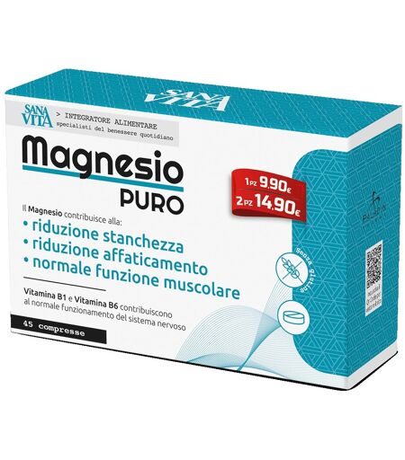 Sanavita Magnesio Puro 45 Compresse Caratteristiche: Sanavita Magnesio Puro è un **integratore alimentare** a base di **Magnesio, Vitamina B1 e Vitamina B6**, formulato per **supportare il metabolismo energetico** e favorire il **benessere del sistema nervoso**. Il **Magnesio** contribuisce a ridurre **stanchezza e affaticamento**, mentre le **Vitamine B1 e B6** aiutano a mantenere una corretta **funzione nervosa e muscolare**. Ideale per chi ha un **aumentato fabbisogno di minerali** a causa di stress, sport o alimentazione poco bilanciata. Con Magnesio per ridurre stanchezza e affaticamento Vitamine B1 e B6 per il benessere del sistema nervoso Supporta il metabolismo energetico e l'equilibrio elettrolitico Favorisce la funzione muscolare e nervosa Indicato in caso di stress, affaticamento e attività sportiva Formato pratico in compresse per un dosaggio preciso Confezione da 45 compresse per un trattamento efficace FAQ Sanavita Magnesio Puro: Come si assume Sanavita Magnesio Puro? Si consiglia di assumere 1-2 compresse al giorno con un bicchiere d’acqua, preferibilmente lontano dai pasti. Sanavita Magnesio Puro aiuta a ridurre la stanchezza? Sì, il Magnesio e le Vitamine B1 e B6 contribuiscono alla riduzione della stanchezza e dell'affaticamento, migliorando l'energia e il benessere generale. È utile per chi pratica sport? Sì, è indicato per gli sportivi in quanto aiuta a mantenere il corretto equilibrio elettrolitico e il buon funzionamento muscolare. Sanavita Magnesio Puro può essere assunto tutti i giorni? Sì, può essere assunto quotidianamente per supportare il benessere del sistema nervoso e muscolare. Per un uso prolungato, si consiglia di consultare un medico. Ci sono controindicazioni all’uso di Sanavita Magnesio Puro? Non sono note controindicazioni particolari se assunto nelle dosi consigliate. In caso di patologie renali o altre condizioni specifiche, consultare un medico prima dell’uso. ...