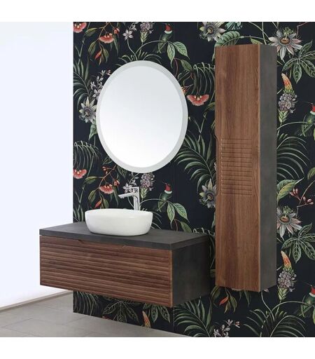 Mobile da bagno sospeso 90 cm completo di lavabo in ceramica e specchio tondo Ravello La composizione bagno sospesa Ravello è realizzata in mdf rivestita in pvc. La struttura in finitura ardesia e top spessore 4 cm. Il frontale del cassetto in noce canaletto riporta un elegante effetto dogato con maniglia integrata nel frontale,molto capiente nasconde al suo interno un piccolo cassetto a scomparsa con salvasifone,comodo per riporre gli oggetti più piccoli. Le chiusura dei cassetti è ammortizzata,così da evitare urti accidentali. La composizione bagno sospesa si completa con un lavabo da appoggio in ceramica bianca e specchio tondo da 80 cm con cornice serigrafata. Riepilogo caratteristiche mobile bagno sospeso: Tipologia:mobile bagno sospeso Ravello Materiale:legno MDF rivestito in pvc Struttura colore:ardesia Ante colore:noce canaletto Mobile bagno già assemblato Top superiore spessore 4 cm NON forato Dimensioni:90 x 40 x 46 cm Cassetti con chiusura soft close INCLUDE kit staffe di ...