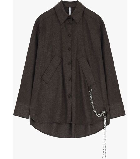 Camicia dal taglio lungo, impreziosita da un colletto classico e chiusura frontale con bottoni. Le ampie tasche applicate e la catena decorativa aggiungono una nota innovativa, offrendo numerose possibilità di espressione personale per uno stile contemporaneo e ricercato. ...