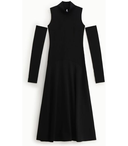 Immagina un abito lungo, strutturato da linee pure e una silhouette avvolgente, caratterizzato dall’assenza di maniche e da un raffinato collo alto. La costruzione minimalista si adatta a contesti urbani e contemporanei, offrendo una base ideale per accessori distintivi e interpretazioni personali. ...