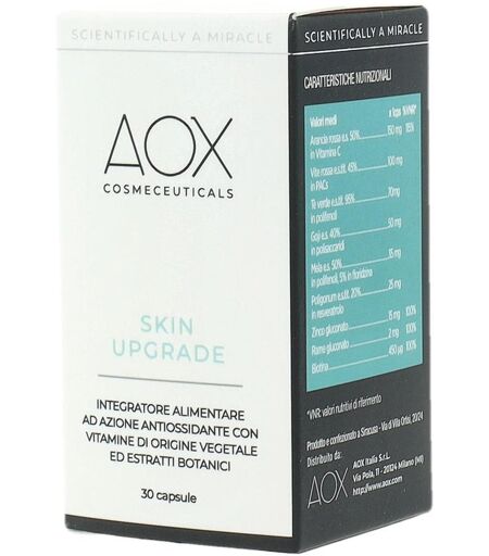 AOX - SKIN UPGRADE - Descrizione Integratore alimentare a base di vitamina C da arancia rossa, con zinco, rame e biotinache contribuiscono alla protezione delle cellule dallo stress ossidativo. Gli estratti di vite rossa, tè verde, goji, mela e poligonum hanno azioneantiossidante. - Ingredienti Ara… ...