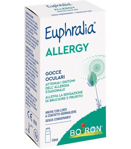 Euphralia - ALLERGY - Descrizione Dispositivo medico ad uso oftalmico costituito da una soluzione sterile, priva di conservanti, a media viscosità, a pH fisiologico ed isoosmotica, specificatamente basata su due gruppi di componenti: acido rosmarinico, vitamina B12, ed allantoina che svolgono un'az… ...
