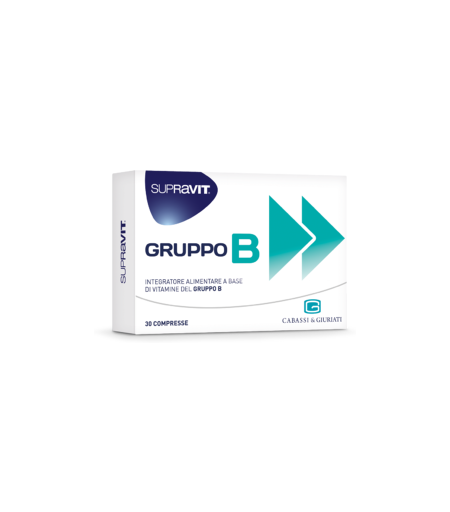 SUPRAVIT GRUPPO B Descrizione Integratore alimentare a base di vitamine del gruppo B, indicato nei periodi di stress psicofisico o nei casi di ridotto apporto con la dieta o di aumentato fabbisogno. Le Vitamine B1, B2, B3, B5, B12 ed H contribuiscono al normale metabolismo energetico e l'Acido Folico contribuisce alla riduzione della stanchezza e dell'affaticamento. Modalità d'uso Assumere 1 compressa al giorno preferibilmente al pasto, con un po' d'acqua. Avvertenze Non superare la dose giornaliera consigliata. Tenere fuori dalla portata dei bambini al di sotto dei 3 anni di età. Gli integratori alimentari non vanno intesi come sostituti di una dieta variata ed equilibrata e di uno stile di vita sano. Formato Blister da 30 compresse in astuccio. ...