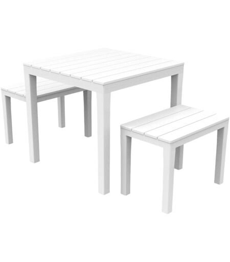 SET SALOTTO DA ESTERNO - Composizione da giardino con 1 tavolo quadrato e 2 panche, Salottino indoor e outdoor da Pic Nic, 100% Made in Italy, Bianco. STRUTTURA E UTILIZZO - Articolo formato da un elegante set da esterno composto da un tavolo quadrato e due panche - Il tavolo ampio e le sedute spaziose garantiscono relax e comodità in casa propria - Perfetto per dei picnic all'aperto - Salottino perfetto per arredare il proprio spazio outdoor o indoor, grazie alla composizione in plastica rinforzata con effetto doghe che ne accresce lo stile - Articolo di design perfetto per brunch, picnic ed aperitivi in terrazzo, veranda, giardino o per rilassarsi a bordo piscina - Set modulabile, è possibile abbinarlo ad altri articoli per creare nuove composizioni. MADE IN ITALY - L'articolo è prodotto in Italia, con l'impiego dei migliori materiali e la massima qualità e cura nei dettagli - L'accortezza dei processi produttivi è sinonimo di affidabilità, resistenza e raffinatezza - La ...