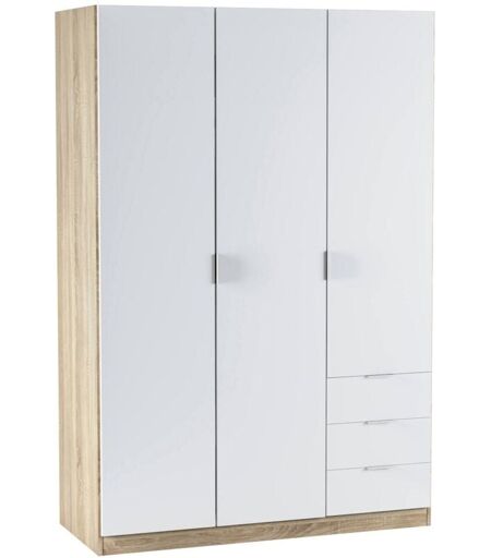 DMORA Guardaroba 3 ante Apaches, Armadio per camera da letto 3 cassetti, Mobile con barra appendiabiti e 3 ripiani, 121x52h180 cm, Bianco e Rovere -