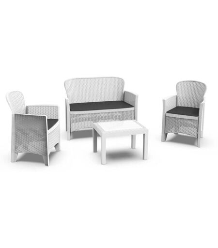 SET SALOTTO DA ESTERNO - Set da giardino con 2 poltrone, 1 divano ed 1 tavolino, Salottino effetto rattan con cuscini, 100% Made in Italy, Bianco. STRUTTURA E UTILIZZO - Articolo formato da un elegante set da esterno per due persone, composto da due sedie con schienale e braccioli, un divano a due posti ed un tavolino, cuscini inclusi - Le sedute spaziose ed accoglienti garantiscono relax e comodità in casa propria - Salottino perfetto per arredare il proprio spazio outdoor o indoor, grazie alla composizione in plastica rinforzata con effetto rattan che ne accresce lo stile - Perfetto per brunch ed aperitivi in terrazzo, veranda, giardino o per rilassarsi a bordo piscina. 100 % MADE IN ITALY - La produzione 100% Italyana garantisce affidabilità, resistenza e durevolezza nel tempo - L'accortezza ai processi produttivi, la scelta di materie prime di qualità e la cura nei dettagli rendono questo prodotto di nobile fattura. CARATTERISTICHE TECNICHE - Interamente composto in resistente ...