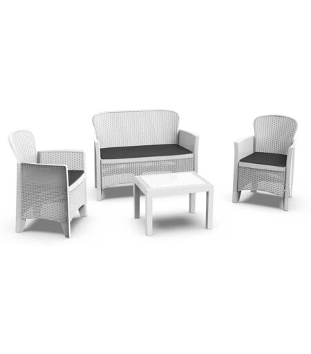 SET SALOTTO DA ESTERNO - Set da giardino con 2 poltrone, 1 divano ed 1 tavolino, Salottino effetto rattan con cuscini, 100% Made in Italy, Bianco. STRUTTURA E UTILIZZO - Articolo formato da un elegante set da esterno per due persone, composto da due sedie con schienale e braccioli, un divano a due posti ed un tavolino, cuscini inclusi - Le sedute spaziose ed accoglienti garantiscono relax e comodità in casa propria - Salottino perfetto per arredare il proprio spazio outdoor o indoor, grazie alla composizione in plastica rinforzata con effetto rattan che ne accresce lo stile - Perfetto per brunch ed aperitivi in terrazzo, veranda, giardino o per rilassarsi a bordo piscina. 100 % MADE IN ITALY - La produzione 100% Italyana garantisce affidabilità, resistenza e durevolezza nel tempo - L'accortezza ai processi produttivi, la scelta di materie prime di qualità e la cura nei dettagli rendono questo prodotto di nobile fattura. CARATTERISTICHE TECNICHE - Interamente composto in resistente ...