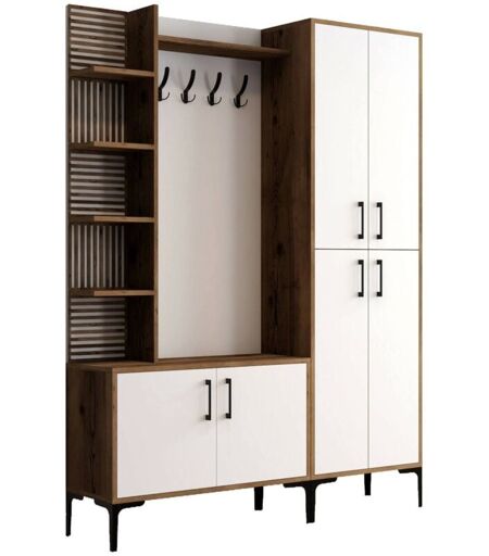 DMORA - Mobile da ingresso Vivian, Entratina appendiabiti, Composizione per atrio, Consolle portaoggetti multifunzione, 150x200 h35 cm, Noce e Bianco