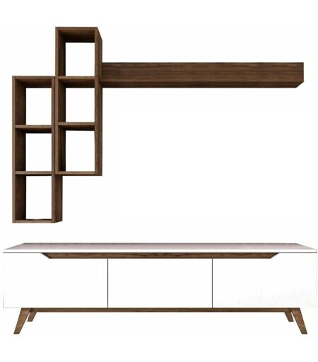 DMORA Mobile porta tv Erato, Credenza da soggiorno, Armadio basso per tv, Base parete attrezzata, 180x35h49 cm, Bianco e Noce, con imballo rinforzato, con
