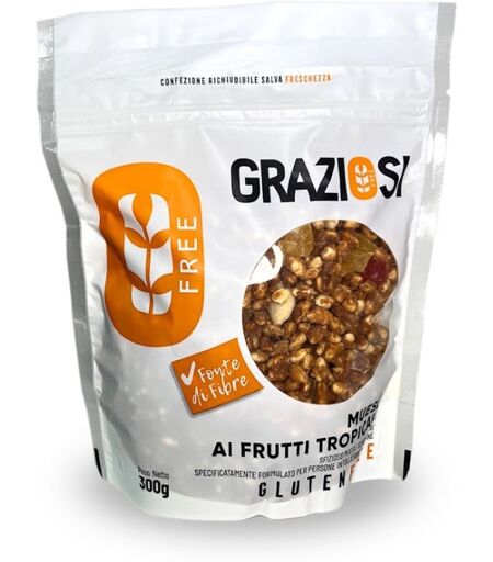 GRAZIOSI - MUESLI AI FRUTTI TROPICALI - Descrizione Muesli senza glutine, specificamente formulato per persone intolleranti al glutine. Ingredienti Avena integrale in fiocchi 22,6%, farina di riso, sciroppo di glucosio, mandorle tostate, mango disidratato (mango, zucchero di canna; acidificante: E3… ...