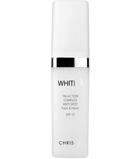 Chrissie White 3 Tri-Action Complex Antimacchia Schiarente Siero antimacchia, depigmentante. Siero schiarente, esfoliante e antiossidante, previene e attenua le macchie scure cutanee, minimizza le discromie uniformando e illuminando la pelle. Protezione solare Spf15. White3-Complex è un efficace trattamento di origine biotecnologica particolarmente attivo sugli enzimi responsabili della formazione e del rilascio dei granuli di melanina da parte dei melanociti. La sua formulazione contiene: - alfa-arbutina, la cui azione inibisce l’attività dell’enzima tirosinasi sulle iperpigmentazioni; - resveratrolo, dalle importanti proprietà antiossidanti. Diminuisce l’attività dei melanociti con una riduzione delle macchie; - acidi della frutta che esfoliano delicatamente la pelle, riducendo l’intensità delle iperpigmentazioni; - estratto di alga bruna caratterizzata da azione depigmentante; - composti della vitamina C. L’incarnato è più luminoso e omogeneo, le macchie scure sono visibilmente attenuate. Nichel tested. Clinicamente e dermatologicamente testato.Modo d'uso: Applicare mattino e sera su viso e collo da solo o prima del trattamento abituale.Ingredienti:Aqua (Magnetized Water), Propylheptyl Caprylate, Ethylhexyl Methoxycinnamate, Disodium Phenyl Dibenzimidazole Tetrasulfonate, Glyceryl Stearate, Dicaprylyl Ether, Glycereth-26, Pentaerythrityl Distearate, Triethanolamine, Alpha- Arbutin, Resveratrol, Halidrys Siliquosa Extract, Ascorbyl Tetraisopalmitate, Magnesium Ascorbyl Phosphate, Yeast, Ceteareth-20, Mannitol, Ceteareth-12, Cetearyl Alcohol, Cetyl Palmitate, Titanium Dioxide, Bis-Ethylhexyl Hydroxydimethoxy Benzylmalonate, Cellulose, Acrylates/C10-30 Alkyl Acrylate Crosspolymer, Sodium Phytate, Lactic Acid, Acrylates Copolymer, Barium Sulfate, Ci 77492, Ci 77491, Propanediol, Glycerin, Glycogen, Sodium Lactate, Glycolic Acid, Silica, Caprylic/Capric Triglyceride, Ci 77499, Hydroxypropyl Methylcellulose, Sucrose, Urea, Sodium Citrate, Malic Acid, Tartaric Acid, Phenoxyethanol, Ethylhexylglycerin. ...