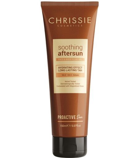Chrissie Proactive Sun Soothing Aftersun Fluido gel doposole idratante e lenitivo adatto a tutti i tipi di pelle, anche quelle più sensibili. Prolunga e migliora l'abbronzatura mentre dona comfort e una sensazione di freschezza immediata. Dermatologicamente testato. Nichel tested.Modo d'uso: Applicare su viso e corpo dopo l'esposizione solare e massaggiare delicatamente fino a completo assorbimento.Ingredienti:Aqua (Magnetized Water), Glycerin, Coco-Caprylate, Polyacrylamide, Ectoin, Ascorbyl Tetraisopalmitate, Tocopheryl Acetate, Capparis Spinosa Extract, Vitex Agnus Castus Extract, Cucurbita Maxima Fruit Extract, Caprylyl Glycol, Hydrolyzed Vegetable Protein, Acetyl Tyrosine, Baicalin, Hydrolyzed Soy Protein, Butylene Glycol, Pectin, Arginine, Proline, Serine, Glucose, Sorbic Acid, Carrageenan, Phenoxyethanol, C13-14 Isoparaffin, Propanediol, Octyldodecyl Myristate, Xanthan Gum, Laureth-7, Ethylhexylglycerin, Parfum, Mica, Ci 77491, Alcohol Denat. ...