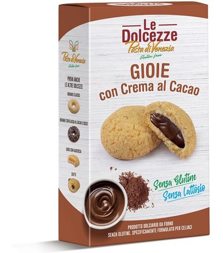 Pasta di Venezia GIOIE con Crema al Cacao Descrizione Gioie con crema al cacao. Prodotto dolciario da forno, specificamente formulato per celiaci. Ingredienti Preparato alimentare senza glutine (fecola di patate, farina di riso, farina di miglio bruno, maltitolo; addensanti: gomma di guar, idrossipropilmetilcellulosa; fibra di psyllium), margarina (grasso di palma, olio di girasole, acqua; emulsionanti: mono e digliceridi degli acidi grassi da palma, lecitina di girasole; conservante: sorbato di potassio; correttore di acidità: acido citrico; aromi; colorante: betacarotene), zucchero, uova pastorizzate, vanillina, aromi. RIPIENO: crema al cacao magro 29% sul totale del prodotto (edulcorante: maltitolo; olio di semi di girasole, cacao in polvere 12%, pasta di nocciole 3%; emulsionante: lecitina di soia; aromi). Senza glutine e lattosio. Caratteristiche nutrizionali Valori medi per 100 g Energia 1.971 kJ/471 kcal Grassi di cui acidi grassi saturi 22,8 g 8,9 g Carboidrati di cui zuccheri di cui polioli 61,3 g 28,8 g 2,78 g Fibre 2,8 g Proteine 4,3 g Sale 0,07 g Conservazione Conservare in luogo fresco e asciutto, lontano da fonti di luce diretta e calore. Validità a confezionamento integro: 14 mesi. Formato Confezione da 180 g. ...
