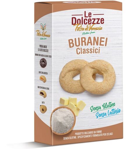 Pasta di Venezia BURANEI Classici Descrizione Buranei classici. Prodotto dolciario da forno, specificamente formulato per celiaci. Ingredienti Preparato alimentare senza glutine 49% (fecola di patate, farina di riso, farina di miglio bruno, maltitolo; addensanti: gomma di guar, idrossipropilmetilcellulosa; fibra di psyllium), zucchero, uova pastorizzate, margarina 14% (grasso di palma, olio di girasole, acqua; emulsionanti: mono e digliceridi degli acidi grassi da palma, lecitina di girasole; conservante: sorbato di potassio; correttore di acidità: acido citrico; aromi; colorante: betacarotene), vanillina, aromi. Senza glutine e lattosio. Caratteristiche nutrizionali Valori medi per 100 g Energia 1.728 kJ/411 kcal Grassi di cui acidi grassi saturi 13,5 g 7,2 g Carboidrati di cui zuccheri 67,7 g 26,7 g Fibre 2,2 g Proteine 3,7 g Sale 0,08 g Conservazione Conservare in luogo fresco e asciutto, lontano da fonti di luce diretta e calore. Validità a confezionamento integro: 14 mesi. Formato Confezione da 180 g. ...