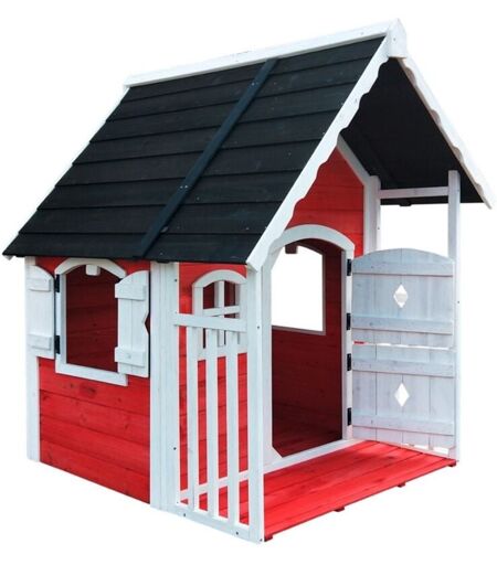 Casetta gioco verniciata in rosso con veranda frontale, dimensioni cm.120x130x140H Per le isole minori ( escluse Sicilia e Sardegna) e laguna veneta, è previsto un supplemento riguardo il costo del trasporto da richiedere prima di effettuare l’ordine. ...