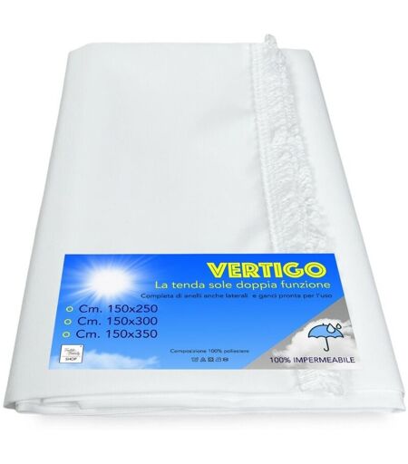 Tenda sole ' Vertigo BIANCO unito ' confezionata già pronta per l'uso realizzata in tessuto indistruttibile di poliestere COMPLETAMENTE IMPERMEABILE. Rifinita nella parte superiore con puntina e occhielli in acciaio mentre nei lati orlo semplice e nella parte inferiore frangia abbinata. È dotata di ganci in plastica che agganciati agli occhielli in acciaio della tenda gli permettono di essere montata su qualsiasi tipo di bastone. Gli anelli in plastica hanno un diametro di 16 mm. mentre quelli in acciaio dove si agganceranno quelli in plastica hanno un diametro di 9 mm. La tenda non è stampata, come nel caso delle tende da sole economiche, ma è in tinto filo. È in tessuto che resiste ad alte temperature ed ha una durata di parecchi anni. -tessuto..................................................poliestere -funzione tessuto....................................coprente -composizione tessuto.................100% poliestere -finitura superiore......................occhielli in accaio ...