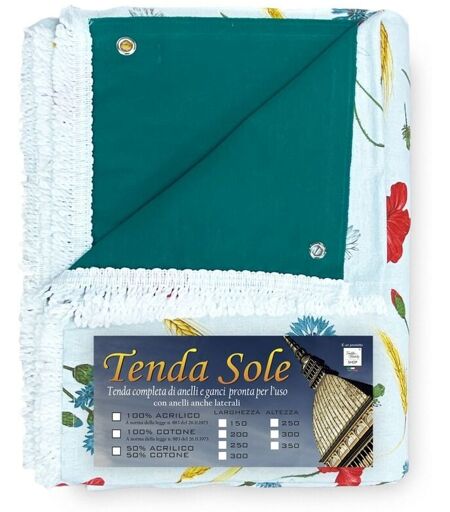 Tenda sole ' stampata papaveri ' confezionata già pronta per l'uso realizzata in tessuto indistruttibile di cotone. Rifinita nella parte superiore con puntina e occhielli in acciaio mentre nei lati orlo semplice e nella parte inferiore frangia abbinata. È dotata di ganci in plastica che agganciati agli occhielli in acciaio della tenda gli permettono di essere montata su qualsiasi tipo di bastone. Gli anelli in plastica hanno un diametro di 16 mm. mentre quelli in acciaio dove si agganceranno quelli in plastica hanno un diametro di 9 mm. La tenda è stampata con colori solidi su un lato, mentre dall'altro lato è in tinta unita verde. È in tessuto di cotone twill che resiste ad alte temperature ed ha una durata di parecchi anni. -tessuto....................................................cotone -funzione tessuto....................................coprente -composizione tessuto.......................100% cotone -finitura superiore.......................occhielli in accaio -finitura ...