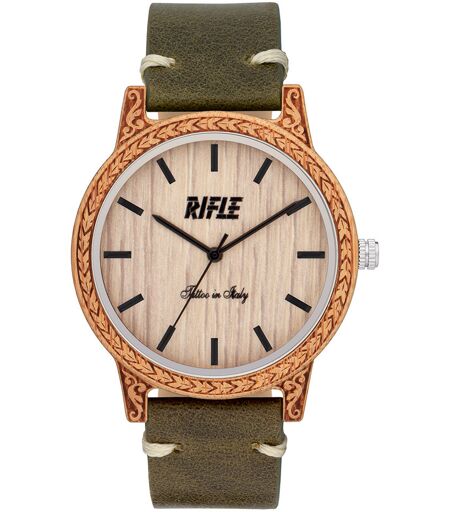 Orologi Rifle realizzati a mano in legno 100% naturale.Originalità Senza Tempo. Rifle presenta il suo nuovissimo: L´orologio Originale, assolutamente unico, sottile e leggero, con un gusto atavico. L´arte dell´incisione è nata con l´uomo e trova la sua espressione più ancestrale nel legno. Bambù e sandalo rosso, essenze leggere incise in Italia, danno vita a un orologio sottile che viaggia nel tempo con la forza delle sue origini.Cassa Dayak Ø 42 mm. Quadrante con indici applicati. Movimento Miyota (Citizen). Finiture: Cassa tatuata e incisa. Legni: bambù, acero chiaro e acero scuro. Cinturino in vitello invecchiato.Dimostriamo il nostro amore per il Futuro attraverso le nostre scelte. Il legno è il materiale con il minor impatto ambientale. È una risorsa naturale, rinnovabile e sostenibile. Il nostro obiettivo principale è stato controllare tutti i nuovi sviluppi del Lifestyle per poi rielaborarli utilizzando materiali naturali, unendo ambiente e moda. In questo modo abbiamo riscoperto il legno, il materiale da costruzione più antico mai utilizzato dall´uomo. Materiale che diventa avanguardia nel design e tendenza. Gli orologi Rifle sono realizzati in acero, sandalo e vena di zebra, tutti materiali di alta qualità. Crediamo fermamente nel concetto eco-friendly e invitiamo tutti a condividerlo. ...