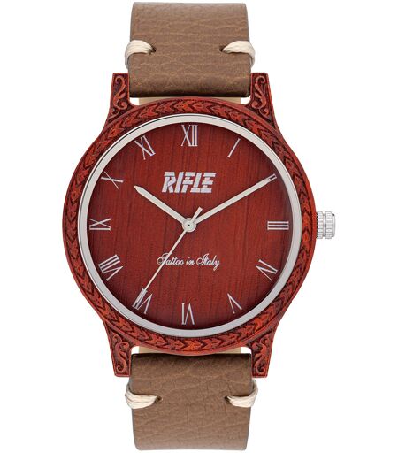Orologi Rifle realizzati a mano in legno 100% naturale.Originalità Senza Tempo. Rifle presenta il suo nuovissimo: L´orologio Originale, assolutamente unico, sottile e leggero, con un gusto atavico. L´arte dell´incisione è nata con l´uomo e trova la sua espressione più ancestrale nel legno. Bambù e sandalo rosso, essenze leggere incise in Italia, danno vita a un orologio sottile che viaggia nel tempo con la forza delle sue origini.Cassa Dayak Ø 42 mm. Quadrante con indici applicati. Movimento Miyota (Citizen). Finiture: Cassa tatuata e incisa. Legni: bambù, acero chiaro e acero scuro. Cinturino in vitello invecchiato.Dimostriamo il nostro amore per il Futuro attraverso le nostre scelte. Il legno è il materiale con il minor impatto ambientale. È una risorsa naturale, rinnovabile e sostenibile. Il nostro obiettivo principale è stato controllare tutti i nuovi sviluppi del Lifestyle per poi rielaborarli utilizzando materiali naturali, unendo ambiente e moda. In questo modo abbiamo riscoperto il legno, il materiale da costruzione più antico mai utilizzato dall´uomo. Materiale che diventa avanguardia nel design e tendenza. Gli orologi Rifle sono realizzati in acero, sandalo e vena di zebra, tutti materiali di alta qualità. Crediamo fermamente nel concetto eco-friendly e invitiamo tutti a condividerlo. ...