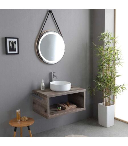 MOBILE BAGNO SOSPESO 80CM E LAVABO TONDO BIANCO STILE INDUSTRIAL Il mobile bagno sospeso Kyoto da 80cm è una scelta elegante e funzionale per chi desidera un bagno moderno con un tocco industriale. Realizzato in rovere fossile, il mobile è dotato di due top e due elementi verticali da 30cm, che offrono ampio spazio per l’organizzazione degli oggetti. Il lavabo da appoggio tondo in ceramica bianco aggiunge un elemento di contrasto raffinato, creando un'armonia perfetta tra materiali e colori. Lo specchio rotondo da 60cm, con laccio nero e illuminazione LED integrata, non solo illumina lo spazio ma dona anche un tocco di stile contemporaneo. Le dimensioni del mobile, sono ideali per sfruttare al meglio lo spazio, mantenendo un design sospeso che facilita la pulizia del pavimento e crea un ambiente visivamente più ampio. Grazie alla qualità dei materiali utilizzati, il mobile è resistente all'umidità e garantisce una lunga durata nel tempo. base con vano a giorno rovere fossile lavabo ...