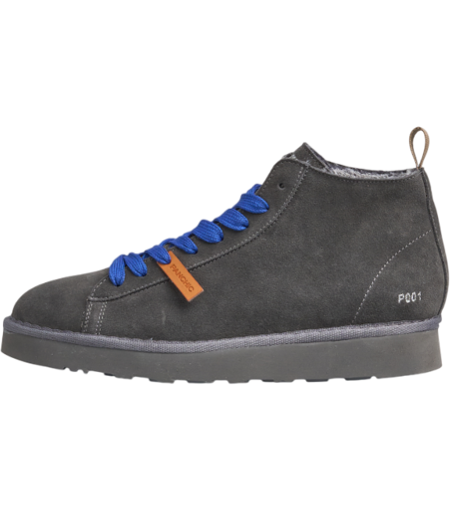 Polacchini uomo P001 con tomaia di camoscio grigio antracite, lacci a trama larga blu e fodera di faux-fur. La P01 con le sue linee pulite rappresenta il perfetto equilibrio fra design e comfort. Suola leggera in EVA alta 2,8 cm con logo Panchic in rilievo; Allacciatura ad otto fori senza occhielli; Fodera di tessuto effetto pelliccia; Sottopiede antibatterico estraibile in microfibra; Comodi elastici interni per agevolare i movimenti e fissare la linguetta; Lacci di ricambio: abbinati al colore della suola; Materiale: 100% pelle. ...