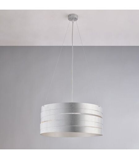 Sospensione ferro laccato bianco con decorazione argento antico e cavi acciaio regolabili 3 luci - H.20 - MAX 120 - Ø45 Misure del prodotto: H.20 - MAX 120 - Ø45 Numero di lampadine: 3 X E27 Potenza: 55 Watt Max Finitura: Argento ...