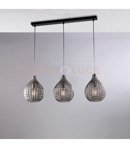 Binario In Ferro Laccato Nero E Montatura Cromo Con Cavi Elettrici Regolabili E Diffusori In Vetro Soffiato Grigio Specchiato Con Decoro Effetto Cristallo 3 Luci ...