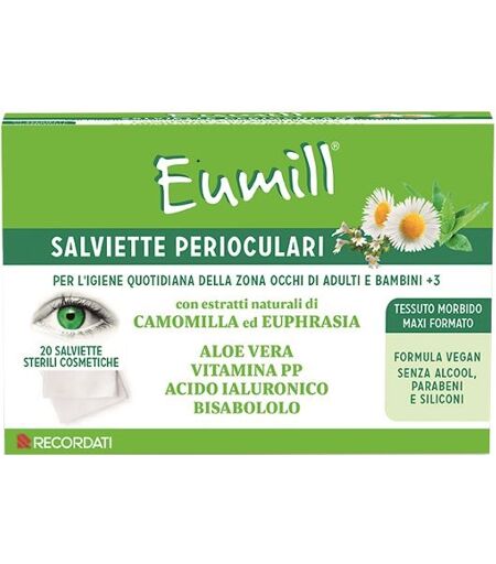 Eumill - Descrizione Le Salviette Perioculari Eumill sono indicate per l'igiene quotidiana della zona occhi di adulti e bambini (sopra i 3 anni). Adatte a tutti i tipi di pelle e agli occhi sensibili. Svolgono un'azione detergente, rinfrescante ed emolliente, rispettando la barriera idrolipidica de… ...