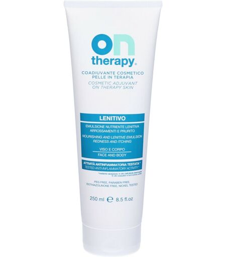 Ontherapy® Lenitiva La crema Ontherapy® Lenitivo è unʼemulsione olio in acqua con tecnologia a cristalli liquidi, arricchita in estratti vegetali dalle spiccate proprietà lenitive che contrastano tutti i fastidi dell’infiammazione; attenuando arrossamenti e irritazioni. La presenza di lipidi vegetali dermo-simili unita a Ceramidi, favorisce il ripristino della barriera cutanea e protegge la pelle dalla disidratazione. Ontherapy® Lenitivo è suggerito a chi, anche in seguito a terapie oncologiche, è soggetto a xerosi, eruzioni maculo papulari (rash cutaneo), fotosensibilizzazioni, eritemi da irraggiamento, eritrodisestesia palmoplantare (sindrome mano piede) e edemi cutanei post operatori. Ontherapy® Lenitivo aiuta a ridare sollievo alla pelle irritata, secca e arrossata, anche in terapia oncologica. Elevata tollerabilità fin dalla nascita – Test Clinico Pediatrico. Ideale per attenuare arrossamenti e prurito. Favorire il ripristino della barriera cutanea e normalizzare le attività delle difese naturali della pelle. Modo d'uso:Più volte al giorno, secondo necessità; applicare sulla zona da trattare massaggiando delicatamente. Ingredienti: Aqua (water), glycine soja oil (glycine soja (soybean) oil), cetearyl alcohol, ethylhexyl palmitate, glycerin, dicaprylyl carbonate, olus oil (vegetable oil), dimethicone, butyrospermum parkii butter (butyrospermum parkii (shea butter)), ribes nigrum seed oil (ribes nigrum (black currant) seed oil), caprylic/capric triglyceride, trehalose, oryza sativa bran oil (oryza sativa (rice) bran oil), urea, ceratonia siliqua gum, sodium hyaluronate, glycyrrhetinic acid, aloe barbadensis leaf juice, sodium pca, tocopherol, olea europaea oil unsaponifiables (olea europaea (olive) oil unsaponifiables), glyceryl stearate, ceramide 1, ceramide 3, ceramide 6 ii, potassium cetyl phosphate, tocopheryl acetate, xanthan gum, cetearyl glucoside, hydrogenated lecithin, tetrasodium glutamate diacetate, cholesterol, phytosphingosine, sodium lauroyl lactylate, lecithin, ascorbyl palmitate, potassium sorbate, polyquaternium-51, ethylhexylglycerin, citric acid, phenoxyethanol, parfum (fragrance). ...